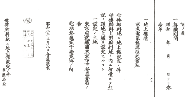 上野までの鉄道敷設には、公園の地上部は走行不可(地下トンネルを掘削)、上野公園内の樹木を損傷してはならない等の厳しい条件が付された上、旧博物館動物園駅の立つ場所は、皇室で代々引き継がれてきた「世伝御料地」という特別な土地であり、駅舎の建設には御前会議での天皇陛下の勅許を得る必要がありました。 御前会議は一度きり、否決された場合は打つ手がないという大変厳しい状況でしたが、都心乗り入れという悲願のため、当社は不退転の決意でこれに臨み、1932年3月に無事勅許を得ることができました。